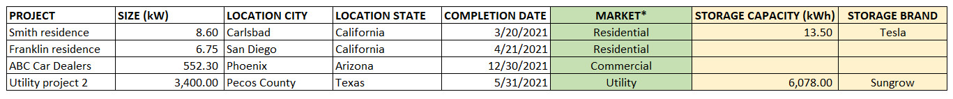 The main list is separated into four main markets: Utility, Commercial, Community (new for 2023) and Residential. Applicants can choose their primary market as “Both Residential and Commercial” if they believe they are equally represented in both markets. Companies choosing this option are asked to include a “market” column in their list of projects (see green column in the example below). Companies will be listed on both the Residential and Commercial market lists based on the kilowatts installed within each market, as reflected in their Excel document. If a market is not listed on the Excel document, project sizes will be understood as: residential projects are smaller than 50 kW; commercial projects are larger than 50 kW.