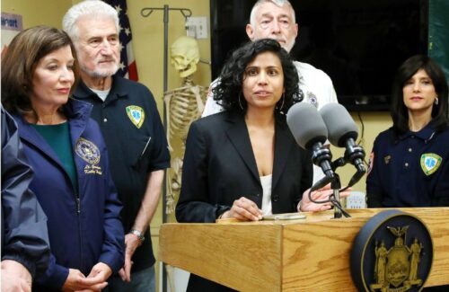 Ramdhari speaks at an event with New York State Gov. Kathy Hochul.