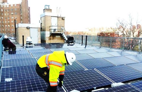 Workers installing solar panels at Carver Houses, a New York City Housing Authority development in northern Manhattan. Photo credit: Accord Power Inc.