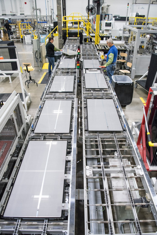 First Solar employees work on Series 4 modules at the company’s Perrysburg, Ohio, manufacturing plant. (Photo by Dennis Schroeder / NREL)