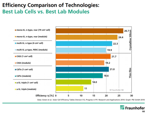 Thin-film’s better resistance to shading is its strongest case for the residential market. Solar Frontier has found utility-scale success with its CIS thin-film, but it also heavily markets its anti-glare black modules to the residential space, especially in its home country of Japan. But if a homeowner has a roof clear of obtrusions and shade, c-Si will produce more energy with fewer panels.