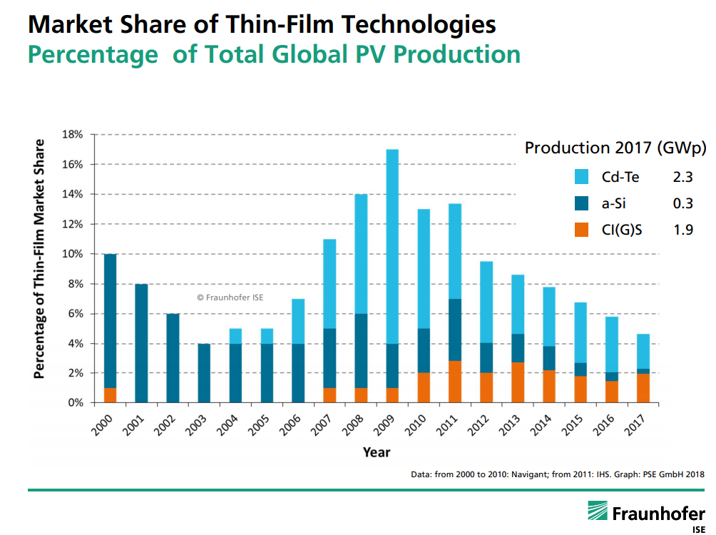 No single thin-film brand appears to be making a grab for c-Si’s market share in the United States. First Solar is expanding its CdTe manufacturing but that’s because it has found that utility-scale sweet spot and is dominating globally. Most CIGS and CIS manufacturers market themselves as niche products.