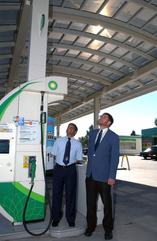 Transparent PV on canopy at a BP gas station with two members of the development team from NREL. Source: NREL