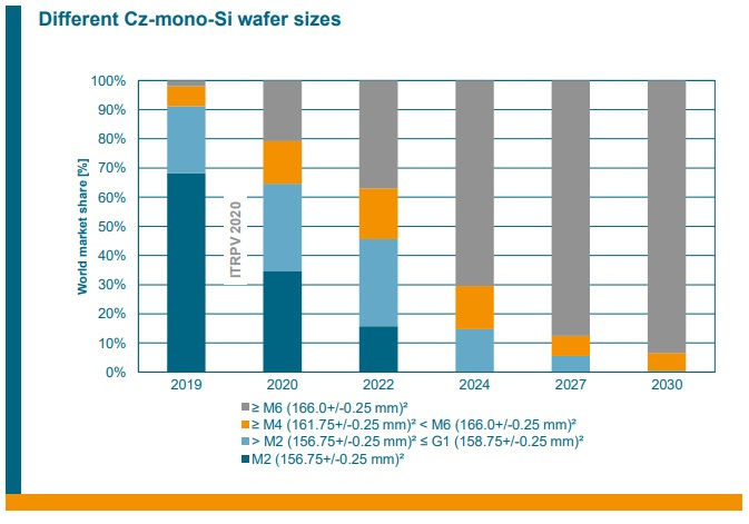 Most solar panels released in the last two years used M2 (156.75-mm) wafers. But research group ITRPV predicts that the M2 wafer will disappear within five years. M6 (166-mm) and larger wafer formats will make up 70% of the multicrystalline market and 90% of the monocrystalline market by 2030.