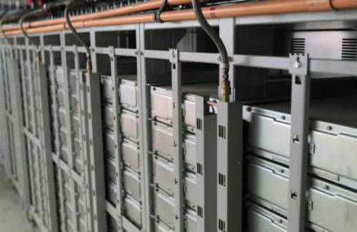 Battery racks at the 1,200-MWh energy storage facility at Moss Landing Power Plant in California. Credit: Vistra