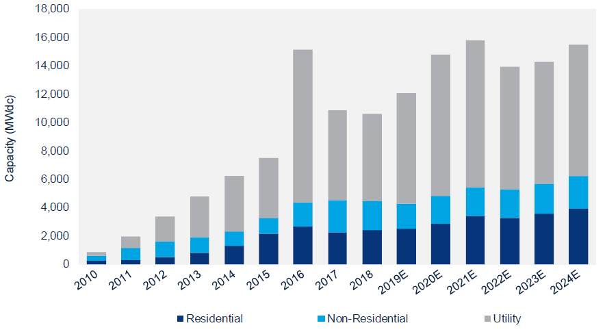 Policy changes and lingering uncertainty around solar panel tariffs saw the U.S. solar market drop 2% in 2018, but strong residential solar interest and a rush to get projects in before the federal ITC begins to step-down have encouraged Wood Mackenzie Power & Renewables and SEIA to predict 14% growth in 2019. The cumulative U.S. operating PV capacity stands at 62 GW, and an additional 12 GW is expected to be installed this year.