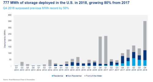Fueled by increased interest in grid service applications like time-of-use (TOU) shifting, self-consumption and backup power, the U.S. market for energy storage doubled in 2018 and is expected to double again by the end of the year. Of the 777 MWh of energy storage deployed in the United States in 2018 (which was an 80% growth over 2017 installs), 47% came from front-of-the-meter (FTM) projects, or those built and operated by utilities. Behind-the-meter (BTM) storage systems, including residential, accounted for the other 53% of installations, and a report from Wood Mackenzie Power & Renewables and the Energy Storage Association (ESA) predicts BTM storage to account for more than half of the annual market in dollar terms by 2021 as residential storage takes off. The groups expect 2019 to close with 1,681 MWh of energy storage deployed in the United States, largely coupled with solar systems.