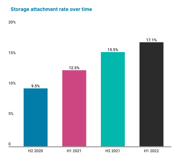 Although storage prices have increased since 2020, solar shoppers are more interested than ever in adding storage to their systems. The storage attachment rate rose in the first half of 2022, with a little over 17% of shoppers installing a battery with their solar system, compared to 15.5% in the second half of 2021.
