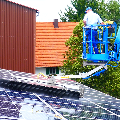 If a solar panel is installed outside (and when isn’t it), it will undoubtedly accumulate debris. Anything from dust to bird droppings can cover a solar module and lead to less output and an unsatisfied system owner. The task of cleaning solar modules is approachable at ground-level, but washing the dust away on a roof or carport is a whole different challenge.