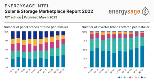 In the second half of 2022, 59% of installers offered only a single inverter brand, the highest level of brand loyalty since EnergySage began tracking this information in 2014. Similarly, over one-third of installers only worked with a single solar panel brand in H2 2022, the highest level since 2015. More than just installer brand loyalty, these trends provide insight into consumer choice and supply chain availability as well.