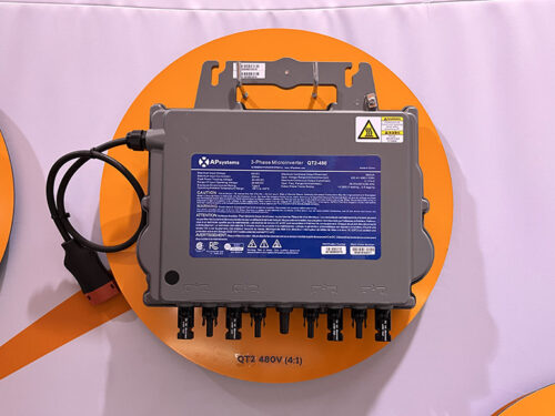 APsystems’ new most powerful QT2 4-module C&I microinverter comes in 208- and 480-V options for less losses and higher output. Both this commercial and the company’s residential DS3 dual-module microinverter are designed to work with the latest high-power modules. The company likely won’t go higher than four modules per micro, but found this solution decreases costs and increases install speed for contractors.