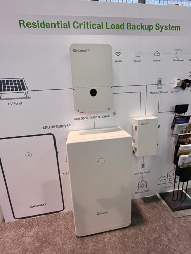 Growatt’s booth displayed numerous solar + storage configurations to fit different residential needs. The company has a whole-home backup solution with 9.9-kWh batteries that can be connected in parallel for nearly 40 kWh of power; a smaller “critical load” backup system designed for just a few essential circuits, and an off-grid system for remote areas.