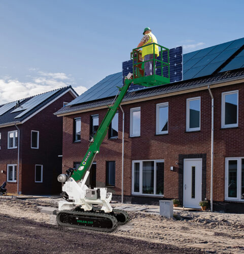 Now smaller-scale construction contractors like residential solar installers can rent “mini cranes” without hiring an outside operator and incurring that additional expense. Bailey Cranes developed the Solar 24T Mini Crane, a telehandler with a stand-in basket that can hold solar panels off its side using a rack. The 24T is operated with radio controls located in the basket and it can reach 24 ft vertically and move 16 ft horizontally.