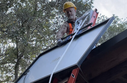 The lift uses patented module hooks that attach to a panel’s frame and, once attached, an operator at the bottom of the ladder pulls the rope to hoist the panel to another person on the roof.